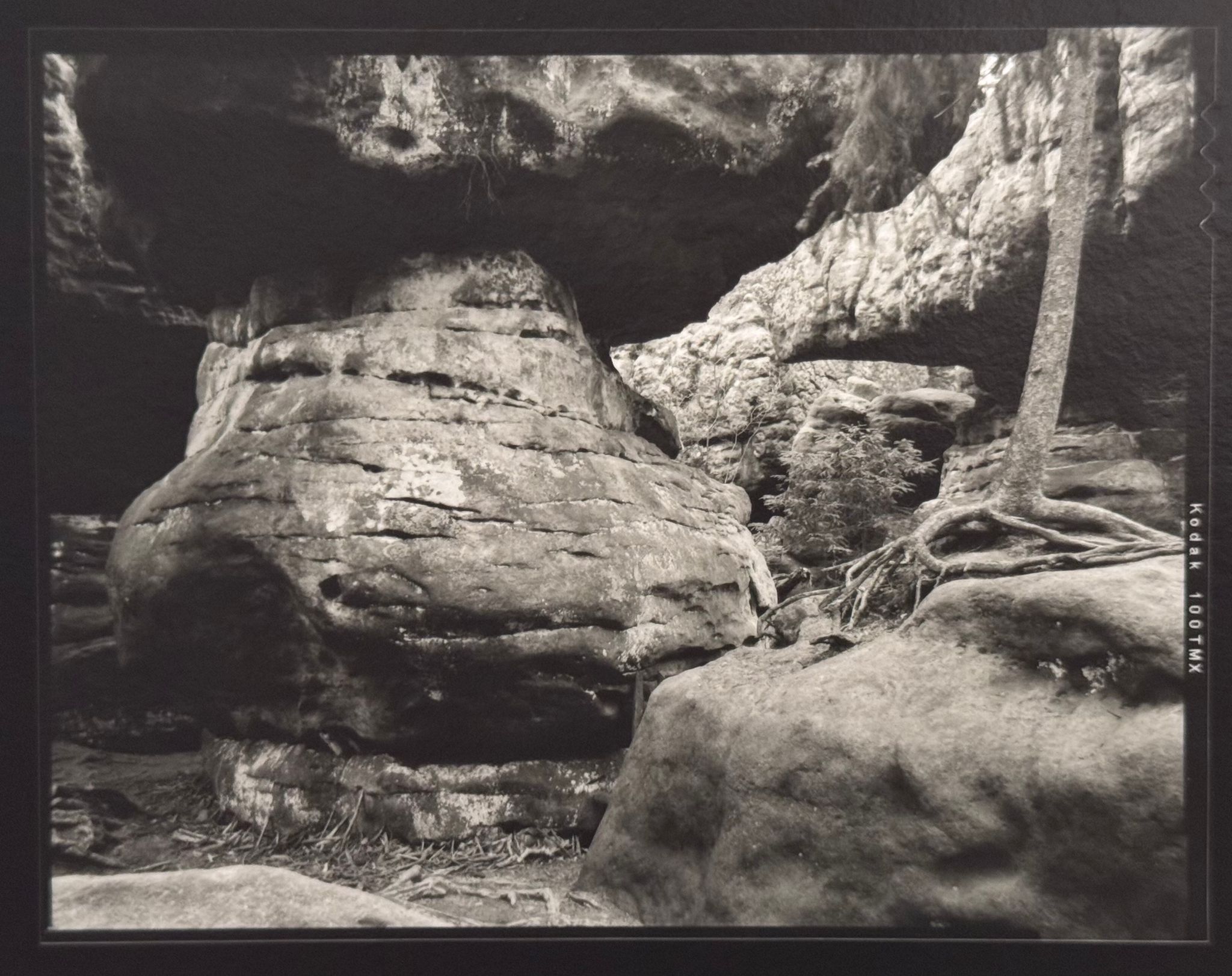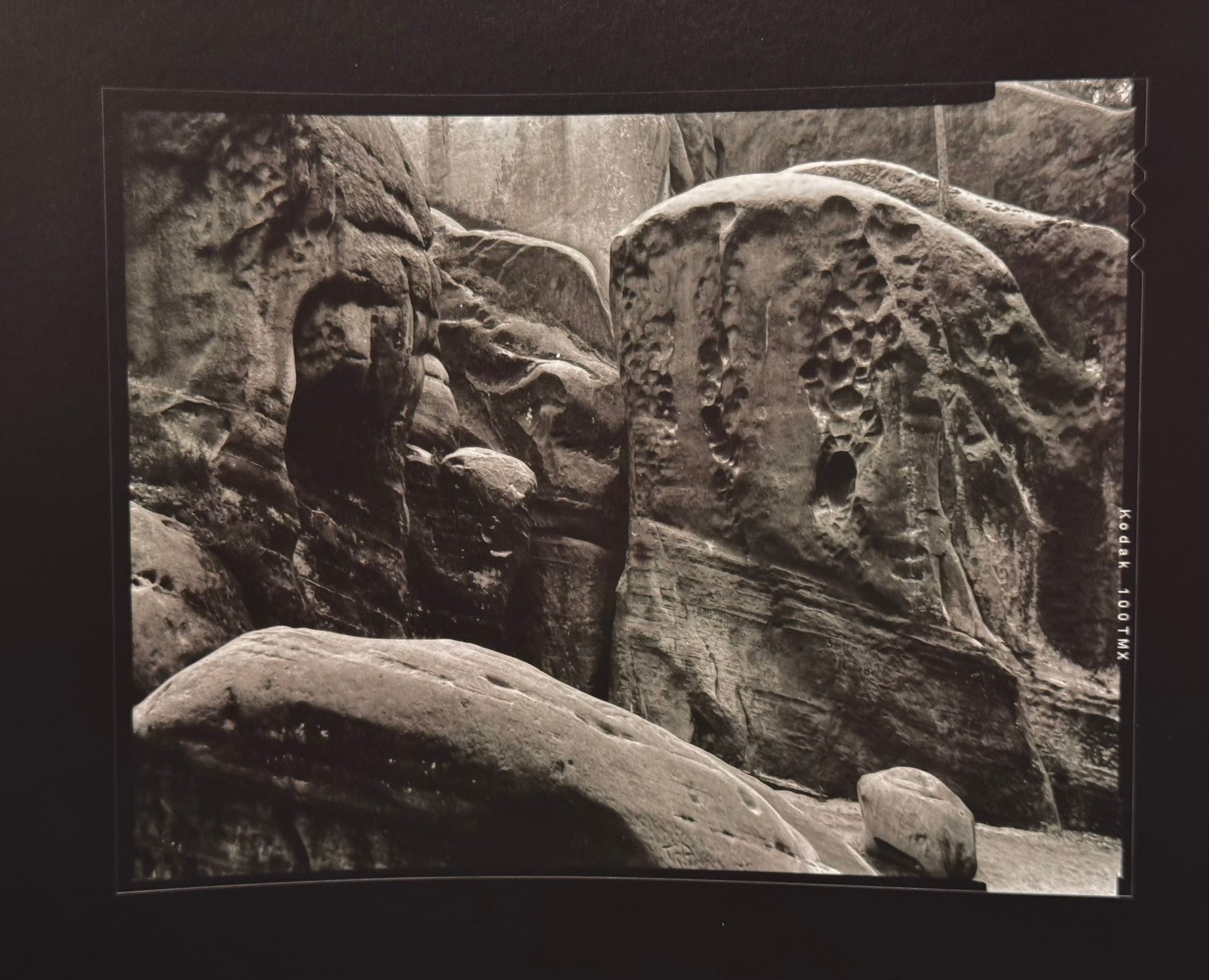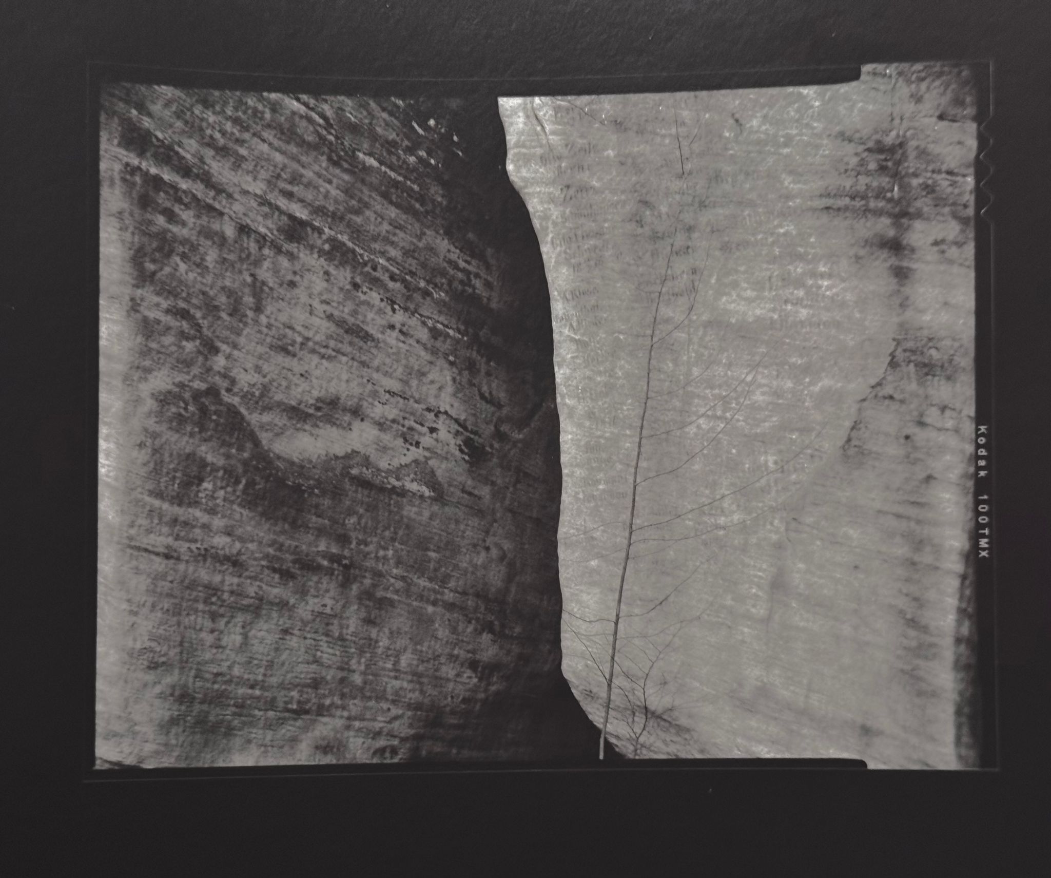 Fotografia wielkoformatowa, szczególnie ta wykonywana aparatem 8×10 cali, wymaga innego rytmu patrzenia i innego rodzaju obecności. W tym układzie Naoczność nie jest aktem rejestracji, tylko spotkania. Negatyw, stykający się bezpośrednio z papierem światłoczułym, przestaje być jedynie medium – staje się świadkiem obecności. Pozostawia ślad bez interpretacji, bez nadmiaru formy. Obraz ma dokładnie taką skalę, jaką miała chwila – jest styczny z rzeczywistością. Nie pomniejsza jej ani nie powiększa, pozwala jej pozostać „taką, jaka jest”: subtelną, cichą, pozornie dostępną. English version of the text